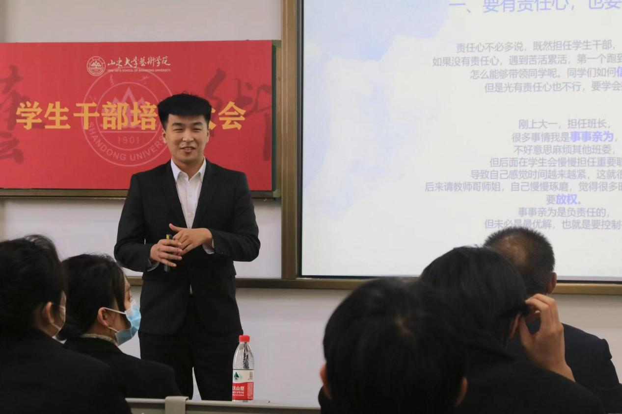 2021届员工会主席、2019级美术班班长丁晓龙同学以承担班长和主席职务的个人成长经历,向同学们阐述了如何加强分工协作,如何发挥员工干部的提纲挈领作用,他认为同学们既要勇于承担责任站在一线,又要学会从工作全局角度考虑问题。