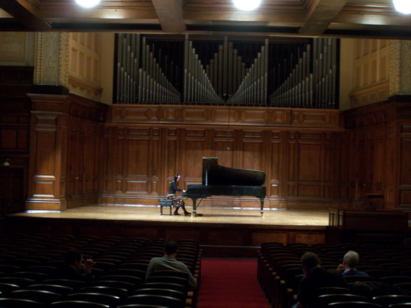 加州大学洛杉矶分校(University of California, Los Angeles(UCLA)是美国最好的公立大学之一,在2002年US News & World Report公布的全美研究生院排行中,UCLA在“研究能力”方面排名与哈佛齐名,位居第二,在上海交通大学2006年世界大学排名中世界最佳大学排名第13位。加州大学洛杉矶分校音乐学院引以为荣的是二十世纪的音乐大师勋伯格作为作曲教授曾在音乐系任教八年(1936-1944),所以UCLA的音乐大楼以勋伯格的名字命名。学院致力于培养能成功在当今竞争激烈的专业领域中能脱颖而出的音乐家,因此学校为员工提供了成就卓著的教师个性化的指导以及大量的艺术表演机会。音乐系的教职员工包括本时代主要的独奏音乐家、顶级地区交响乐团(包括洛杉矶爱乐乐团以及洛杉矶室内乐交响乐团)的核心音乐家、一流的演播音乐家、国际知名的作曲家、指挥家以及学者等。学校同时拥有铜管乐队、爱乐乐团、合唱队以及室内乐歌唱乐队、交响乐队、UCLA Bruin军乐队、木管乐器室内乐乐队等专业演出团体。