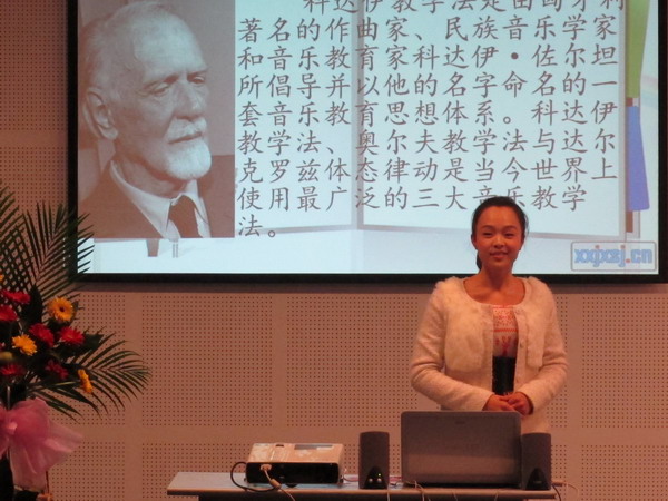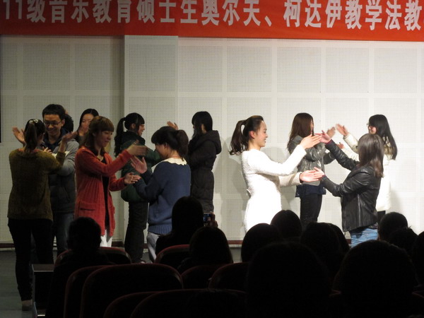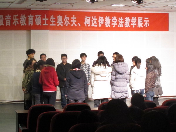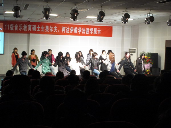 本次教学展示活动由2010、2011级研究生分别展示了运用奥尔夫教学法以及柯达伊教学法对音乐各个方面的教学。其中,奥尔夫教学法的展示主要包括了:张佳伟——“音高与二声部的训练”、徐晓龙——“借助于乐器的节奏训练”、赵爽——“语言与声势的基本节奏训练”;柯达伊教学法的展示则包括了:刘亚辉——“柯达伊柯尔文手势视唱训练”和秦文华——“音乐与动作的训练”。整个展示活动从这几个层面进行了音乐教学并获得了明显的成效。同时,通过与同学们的互动,课堂气氛十分活跃,达到了良好的教学效果。