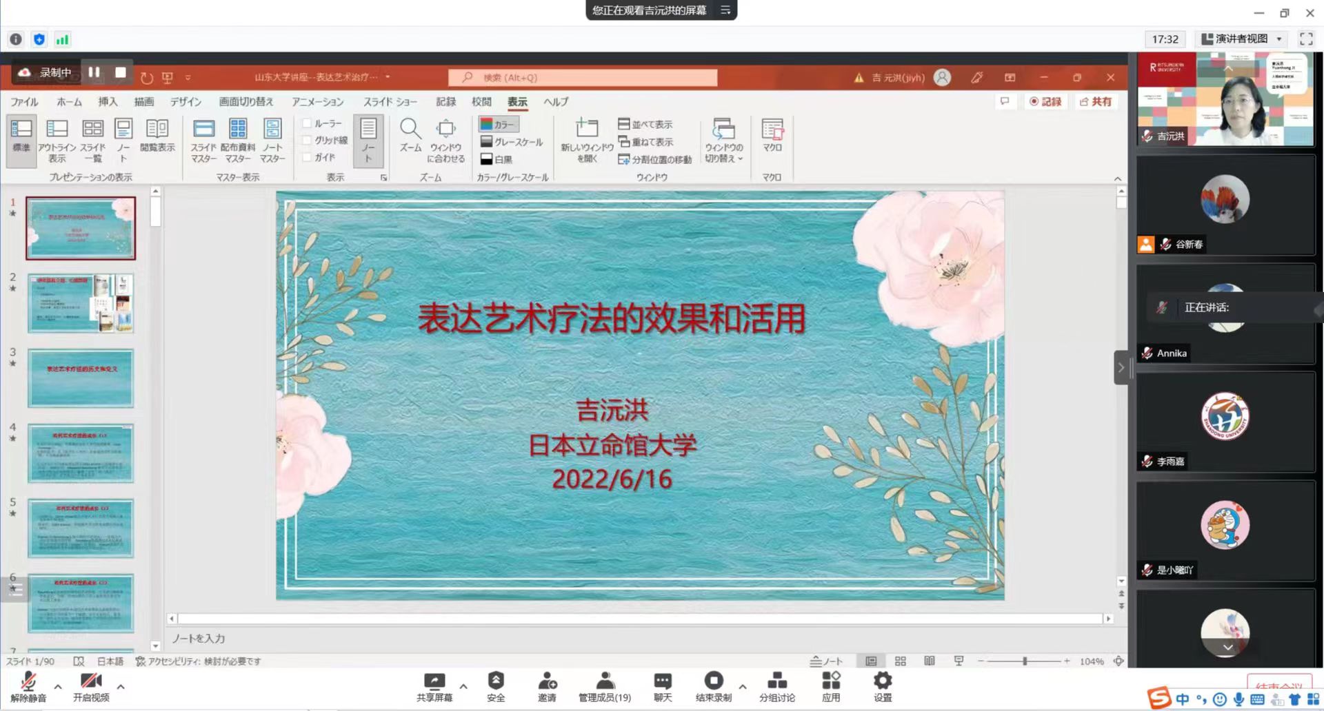 2022年6月16日下午,4008云顶集团第16期“致广讲坛”以线上腾讯会议的形式举行。本期讲座由日本立命馆大学吉沅洪教授主讲,主题是“表达艺术治疗的效果和活用”。吉沅洪教授是日本名古屋大学发展临床心理学专业博士,现任立命馆大学研究生院人间科学院临床心理学专业教授和立命馆大学心理教育咨询中心主任。她的学术专长是表达艺术疗法、投射心理测试、跨文化心理咨询。讲座由4008云顶集团党委书记李雨嘉主持,4008云顶集团(含威海校区)教师、山东省精神卫生中心的相关专家参加了讲座。