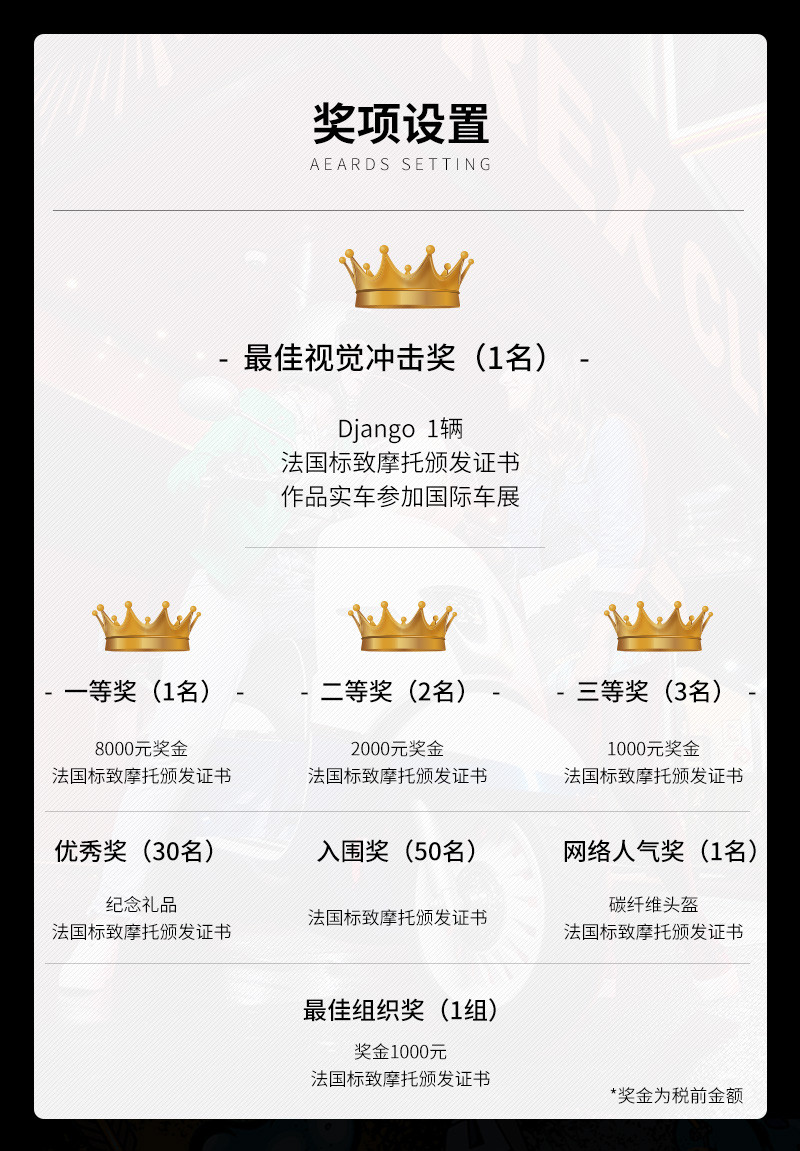 为充分诠释Django所代表的复古文化现象,充分挖掘广大Django爱好者的智慧性和创造力。法国标致摩托决定在全球范围内开展Django涂鸦大赛活动,让Django真正成为创意与潮流的载体。