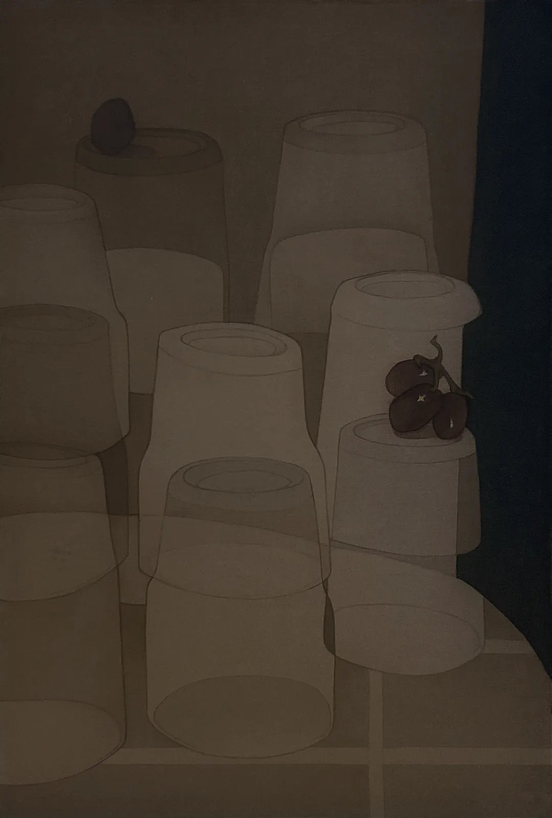 《⼗三只空杯摇篮曲》 绢本设⾊ 30 x 20 cm 2022 胡⻰逸佳