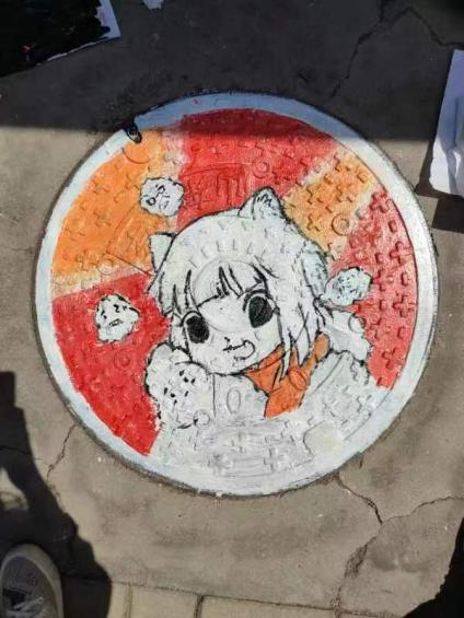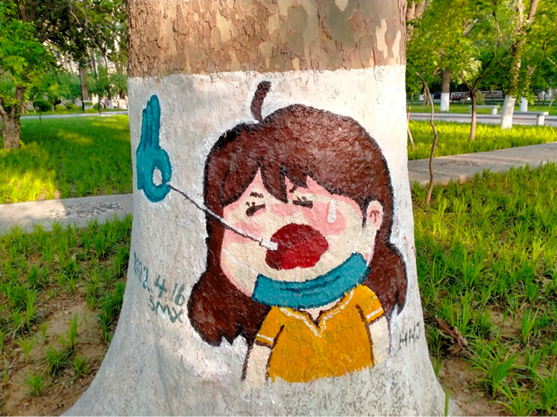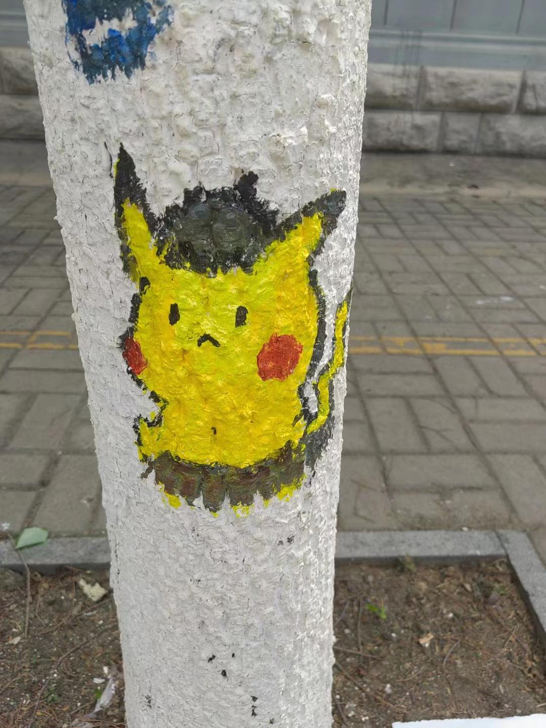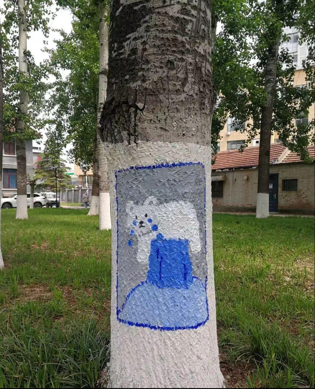 志愿者在12号楼下集合进行首次涂鸦,涂鸦范围是艺术楼和物理楼附近的井盖与树皮。志愿者们自行组成二三人小队进行涂鸦,保证在短时间内进行最高效率的工作。