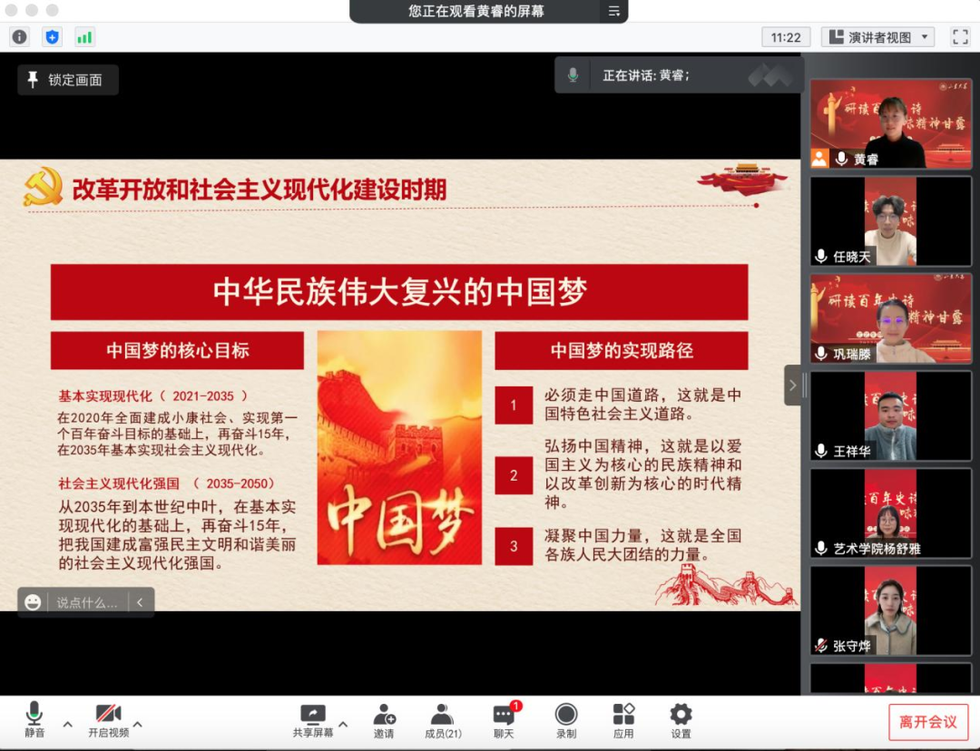 坚定目标跟党走,红色教育显成效。为教育引导全院青年团员深入学习贯彻习近平总书记在庆祝中国共产党成立100周年大会上的重要讲话和党的十九届六中全会精神,不断增强“四个意识”;坚定“四个自信”;做到“两个维护”,学院团委面向各团支部开展“重温光辉历史,品读建党精神--我的红色寒假生活”主题系列活动,进一步推动共青团员党史学习教育向纵深发展,同时积极响应学校号召,依托“红色云展厅”教育资源,开展红色团课学习主题团日活动。 成立“艺艺生辉”硕博宣讲团、“星辰大海”党的十九届六中全会精神本科生宣讲团,积极探索灵活多样的线上宣讲方式,吸引社区群众积极参加,推动全会精神在社会广泛传播。