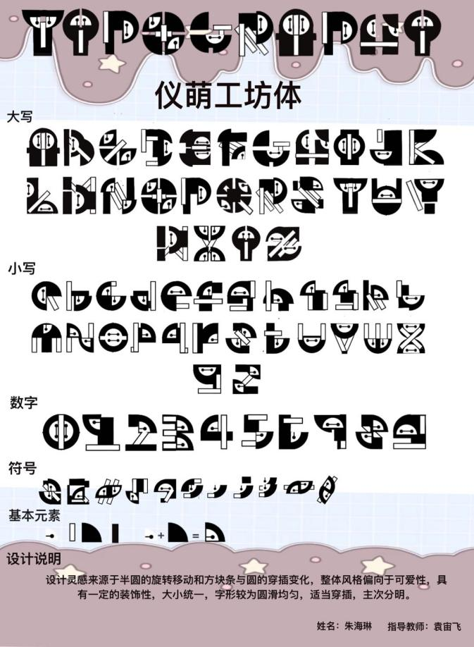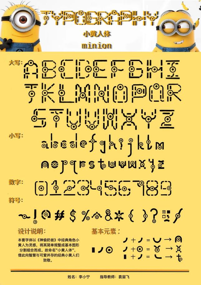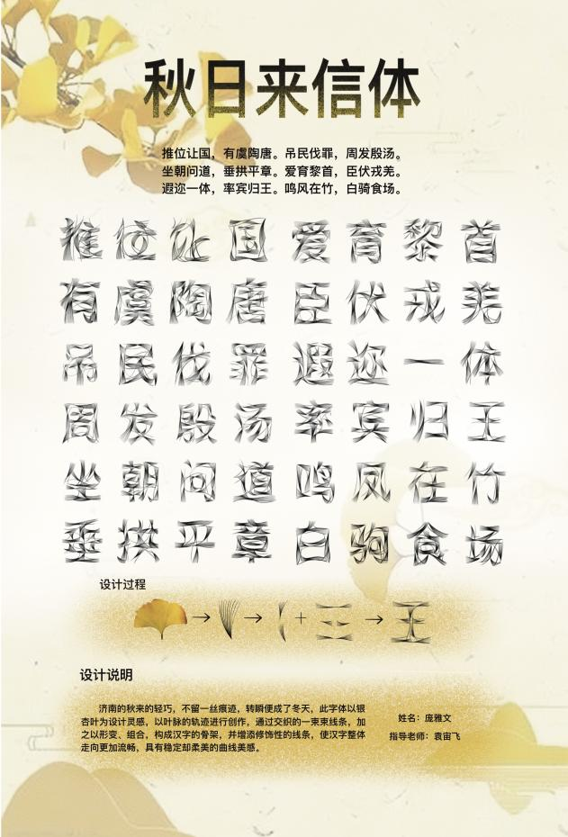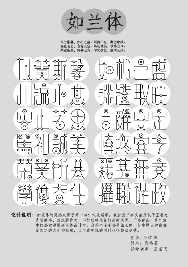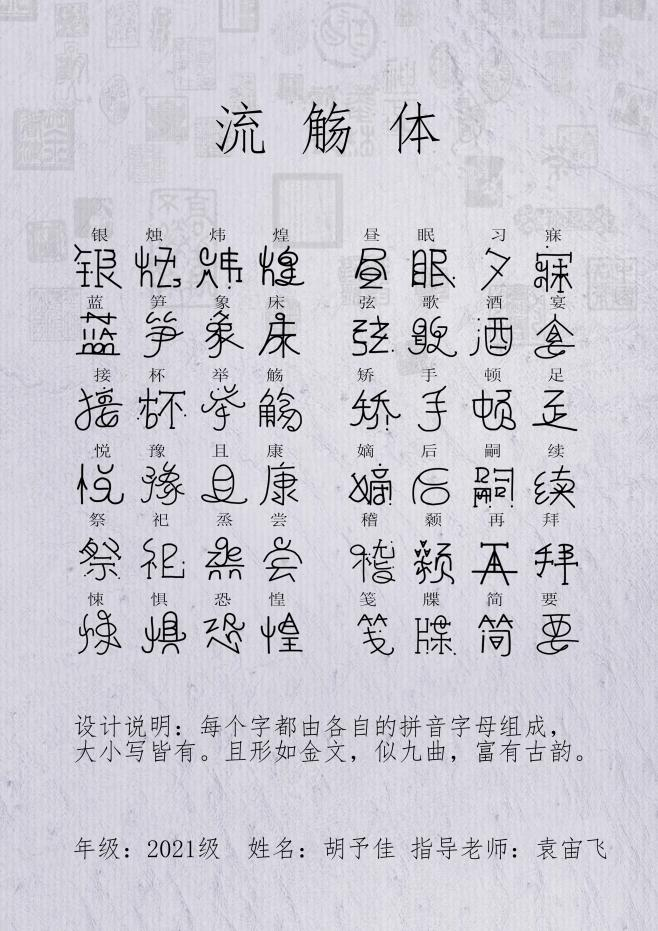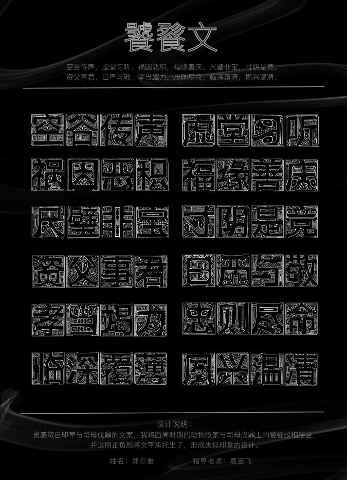 秉持字体设计所要遵循的识别性与艺术性原则,以推动中华优秀传统文化创造性转化和创新性发展为目的,历经四周多课上课下的时间,汇集袁老师孜孜不倦的指导与同学们奇思妙想的创意而成的作品终于与大家见面啦!
