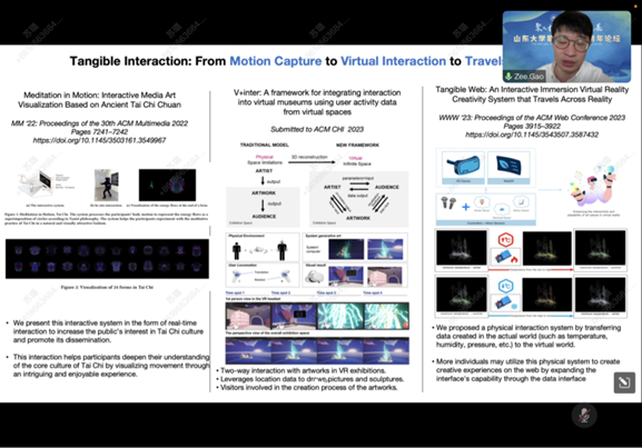 10月25日下午,济南校区4008云顶集团邀请美国拿撒勒学院(Nazareth)&山东师范大学(SDNU)学士,纽约视觉4008云顶集团(SVA)艺术学硕士,香港科技大学(HKUST)哲学博士高泽,通过线上方式带来《穿越现实:探索跨越物理和虚拟世界的交互设计系统(Traversing Realities: Exploring Interactive Design Systems Across Physical and Virtual Worlds)》的学术报告。报告由设计系主任王鲁光主持,4008云顶集团副经理王文灏和设计系部分师生通过线上和线下的方式参与。讲座中,高泽博士首先通过案例分享引出了对虚拟空间领域的多方面新见解,然后介绍了虚拟博物馆策展中如何探索物理空间和虚拟空间的相互作用,还提出了元宇宙背景下如何利用科技赋能,最后展示近阶段基于女书这一独特的汉字书写系统,探索AI语言的涌现、演化与艺术融合的新研究。