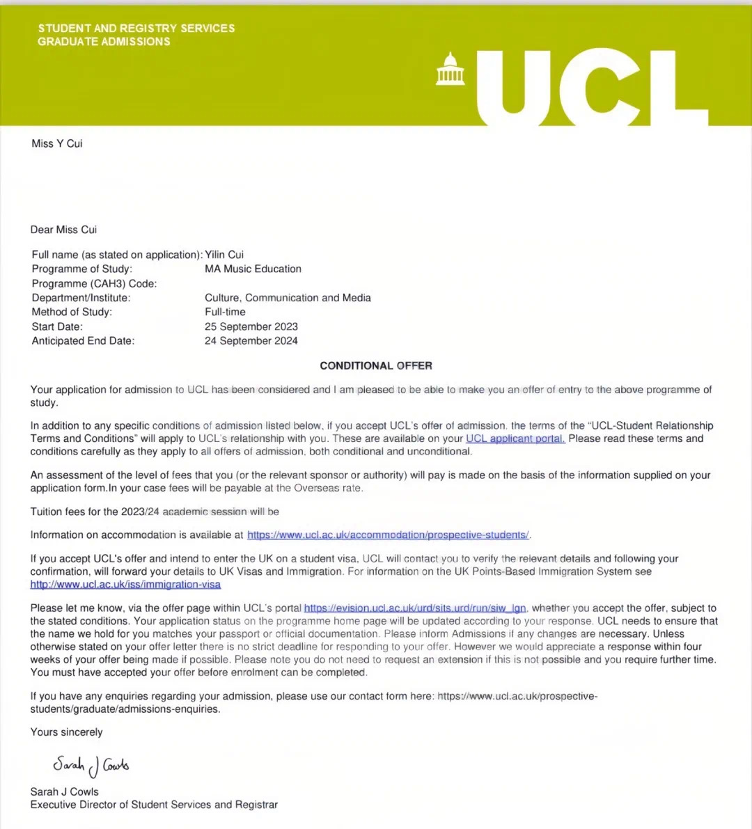 近日,4008云顶集团2019级本科生崔一琳收到伦敦大学学院(University College London,简称:UCL) 录取通知书,继续攻读音乐硕士学位。