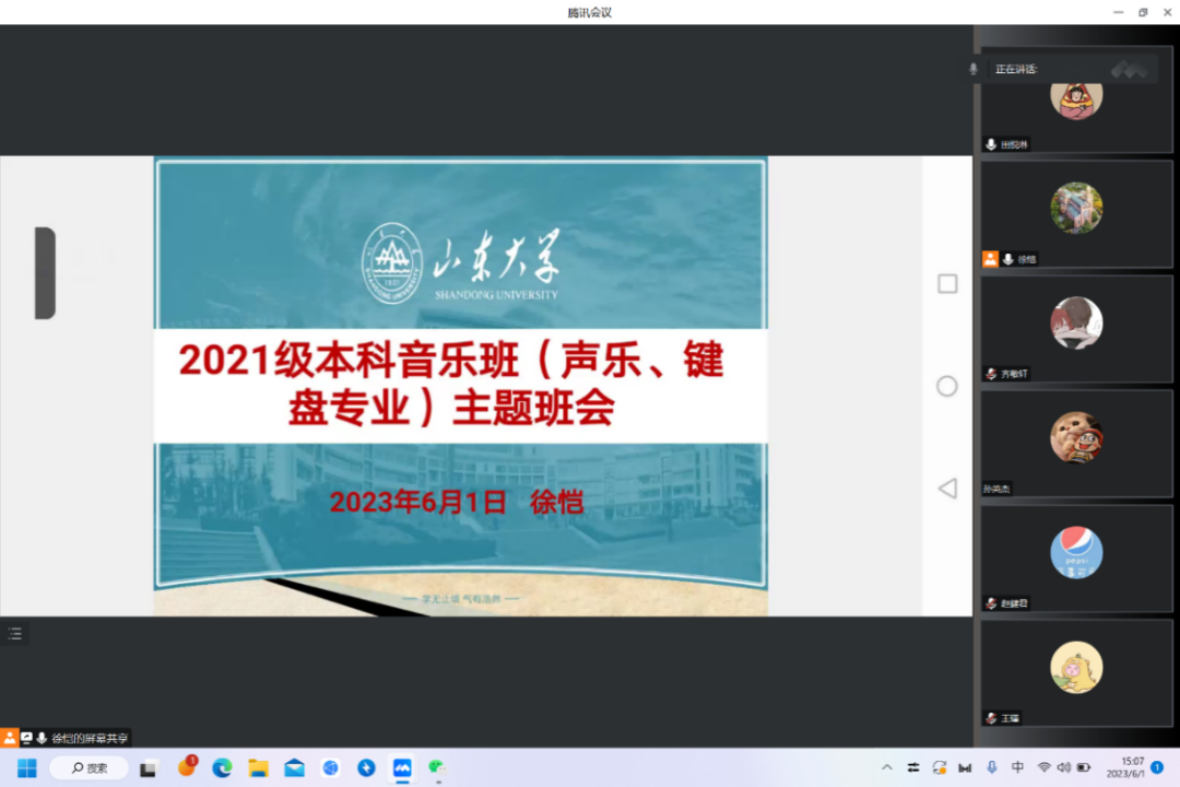 为了帮助同学们了解与学校期末考试有关的最新的管理规定和文件精神,做好期末考试准备,以及指导员工提前进行学涯、职涯、生涯规划,树立科学的成才目标和发展方向,2021级音乐班(声乐与键盘专业)班主任徐恺老师于6月1日在腾讯会议上举行了未来艺术家青春沙龙(第六期)线上主题班会,2021级音乐班(声乐与键盘专业)全体同学参加了会议。