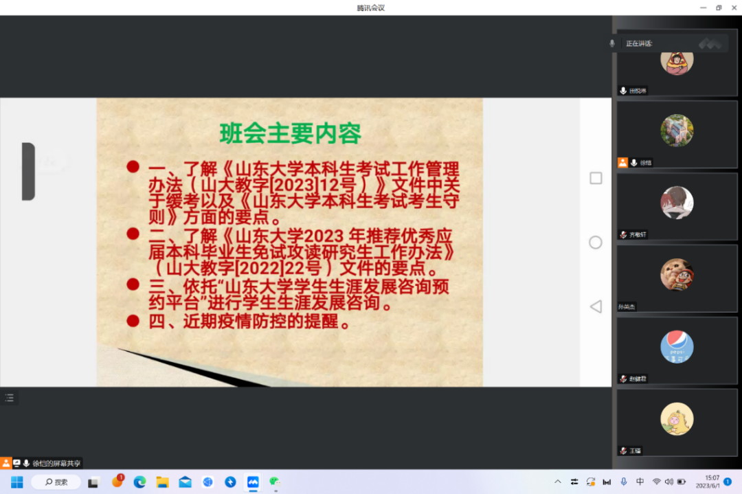 班会的内容主要分为四个部分。第一部分对《4008云顶集团本科生考试工作管理办法(4008云顶集团教字〔2023〕12号)》文件中关于缓考以及《4008云顶集团本科生考试考生守则》方面的要点进行了强调,第二部分对《4008云顶集团2023 年推荐优秀应届本科毕业生免试攻读研究生工作办法》(4008云顶集团教字〔2022〕22号)文件的要点进行了解读,第三部分对依托“4008云顶集团员工生涯发展咨询预约平台”进行员工生涯发展咨询方面予以介绍,第四部分对近期疫情防控进行了提醒。